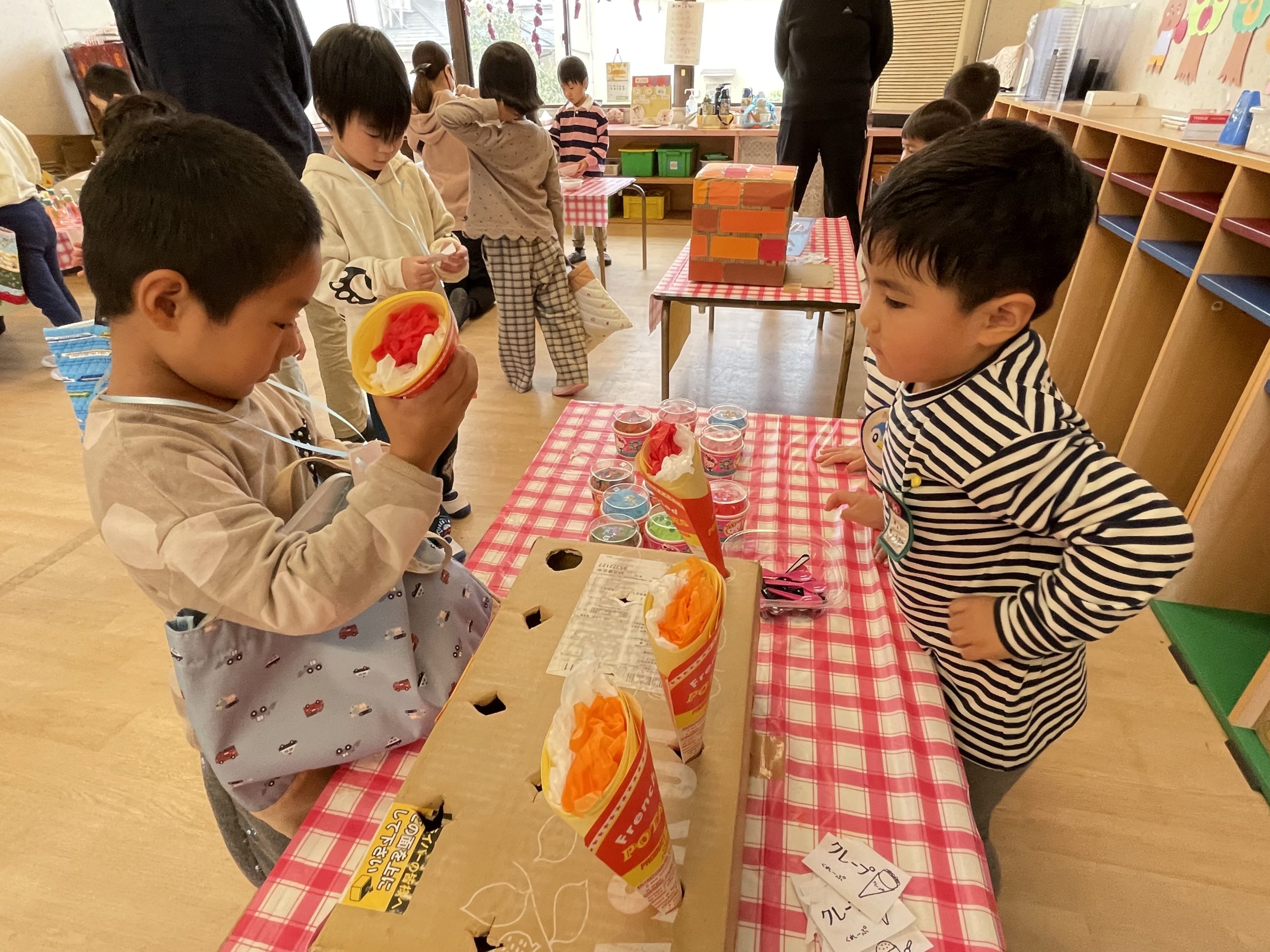 今日は待ちに待ったお店屋さんごっこの日。今年はたくさん美味しいおみせがならびました。店員さんになるのもお客さんになってお買い物するのも楽しかったです。