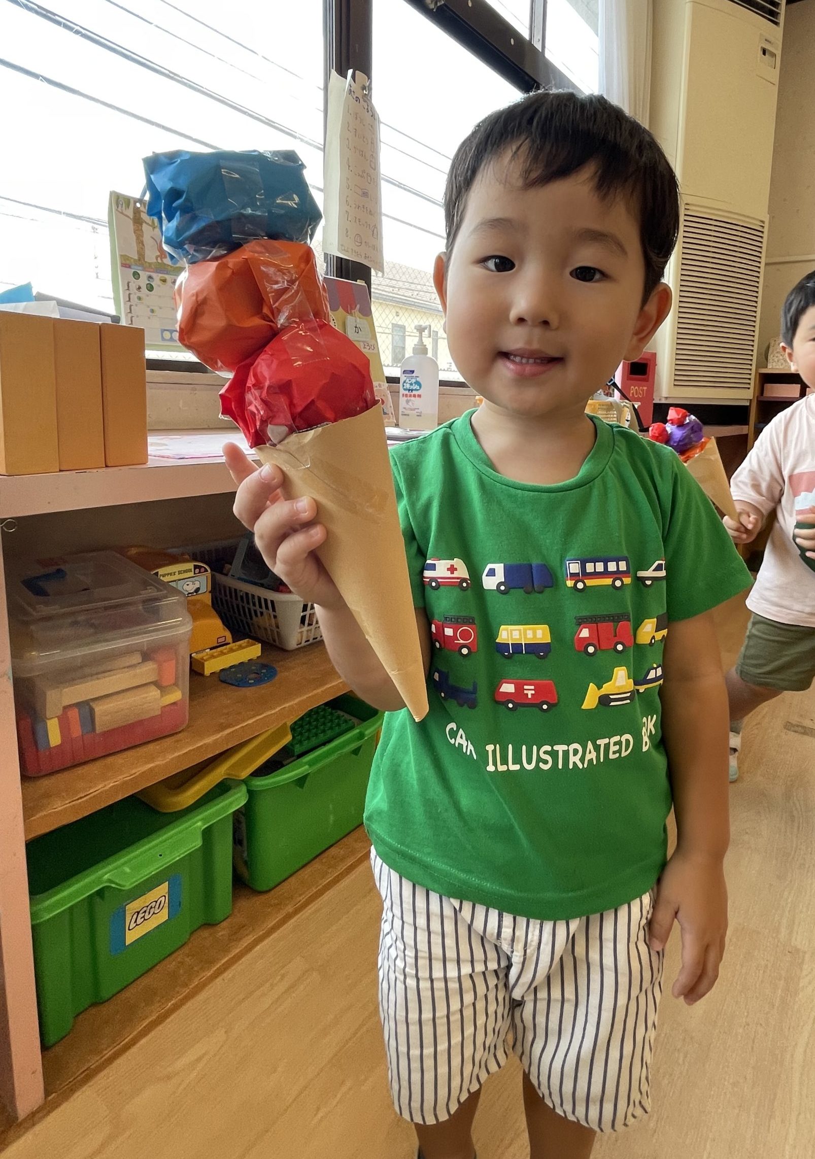 まだまだ暑い日が続いているので、みんなで夢のアイスを作りました。いろんな味のアイスを何段も重ねて大満足のアイスが完成しました。
