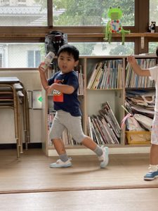 9月1日から保育実習の先生が来てくださっています。今日は先生と一緒にマラカスを作ったよ。おもちゃのチャチャチャのピアノに合わせて楽しくなって隣のクラスまで行っちゃいました。