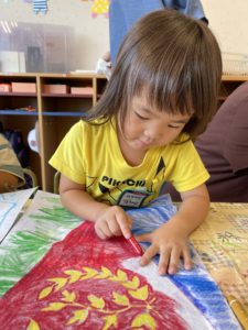 今年のうんどう会では、関西万博のテーマソング『この地球の続きを』に合わせてダンスをします。そこで関西万博の入場ゲートをイメージして万国旗を作ることにしました。それぞれ好きな国の旗を選んで色塗りしました。風になびくと素敵ですよ。