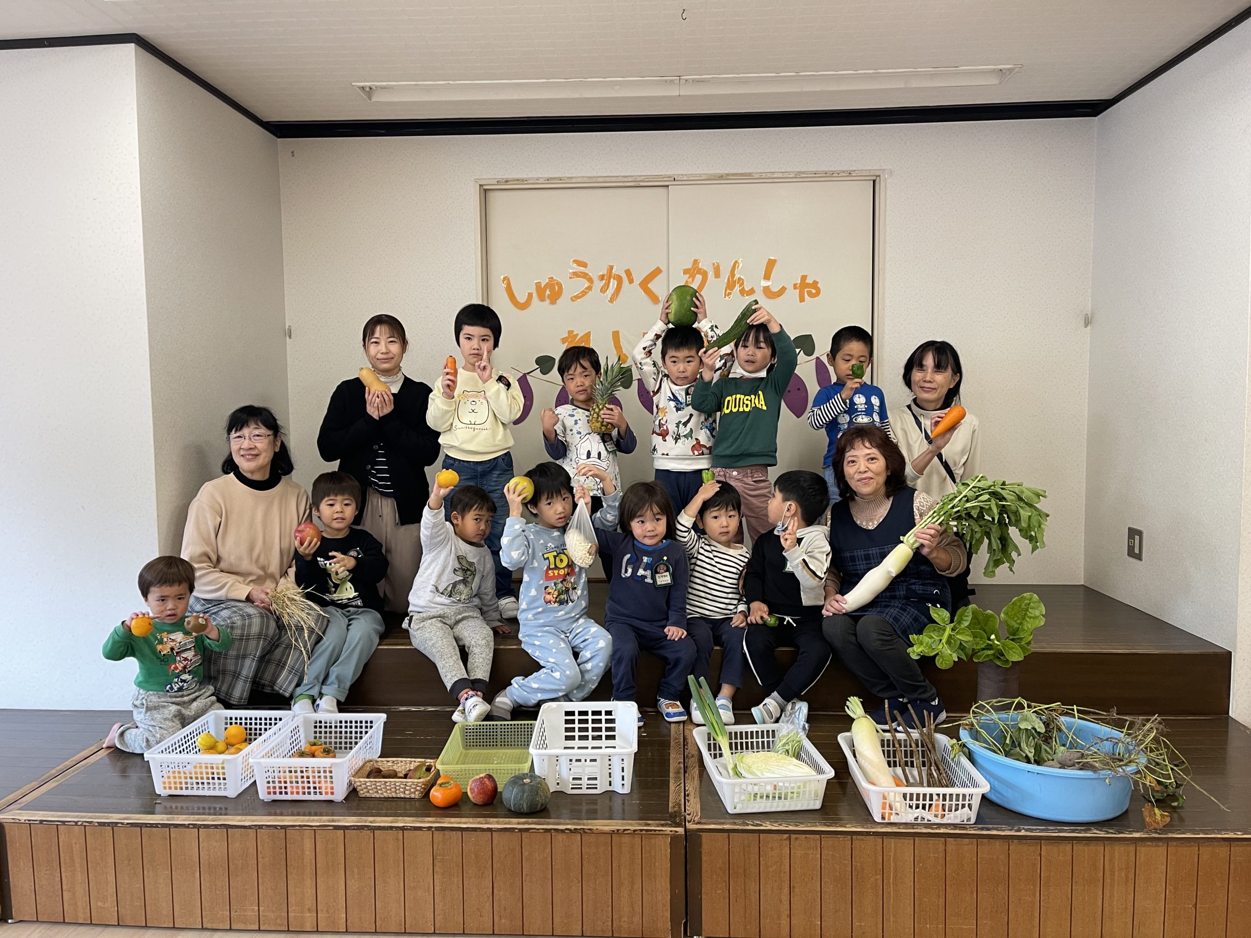 お家からお野菜や果物を持ち寄って収穫感謝礼拝をしました。先日みんなで掘ったさつまいもも葉っぱごと並べました。明日おみそ汁にして頂きます。