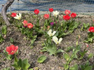 ここ数日温かいなと思ったら園庭の桜もちらほら咲き始めました。子どもたちと植えたチューリップも色とりどりの花をさかせています。新学期がはじまるよと、うきうきしてきますね。